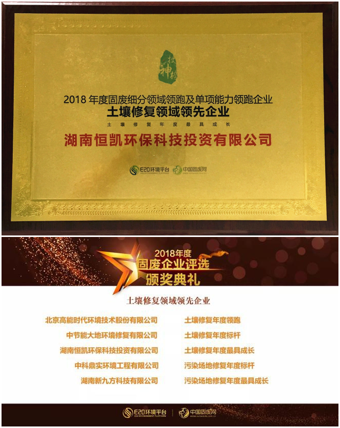 近日,由E20環(huán)境平臺(tái)和中國城市建設(shè)研究院有限公司共同主辦的“2018(第十二屆)固廢戰(zhàn)略論壇”在北京舉行,論壇揭曉了“2018年度(第十屆)固廢企業(yè)評(píng)選”結(jié)果,恒凱環(huán)保繼2017年后,再次獲得“土壤修復(fù)領(lǐng)域領(lǐng)先企業(yè)”榮譽(yù)稱號(hào),公司總裁蔣衛(wèi)山和總工程師羅文連受邀參加了此次頒獎(jiǎng)典禮。